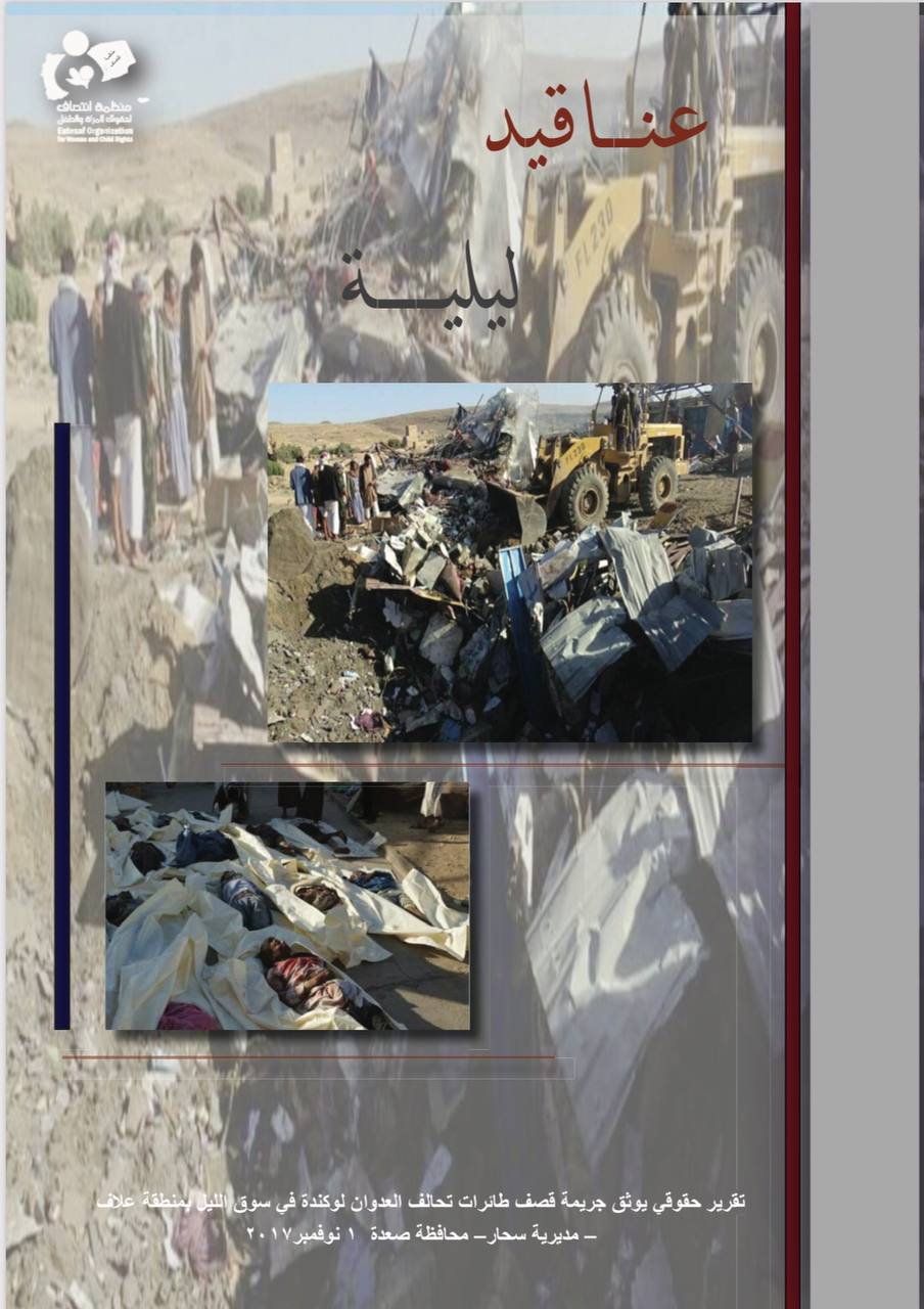 وثقت منظمة انتصاف لحقوق المرأة والطفل تقريراً حقوقياً بعنوان”عناقيد ليلية” حيث تناول التقرير الجريمة التي ارتكبها طيران تحالف العدوان بحق لوكندة في سوق الليل بمنطقة علاف بمديرية سحار التابعة بمحافظة صعدة والتي را ح ضحيتها مدنيين بينهم نساء و أطفال، وذلك بتاريخ 1 نوفمبر 2017م