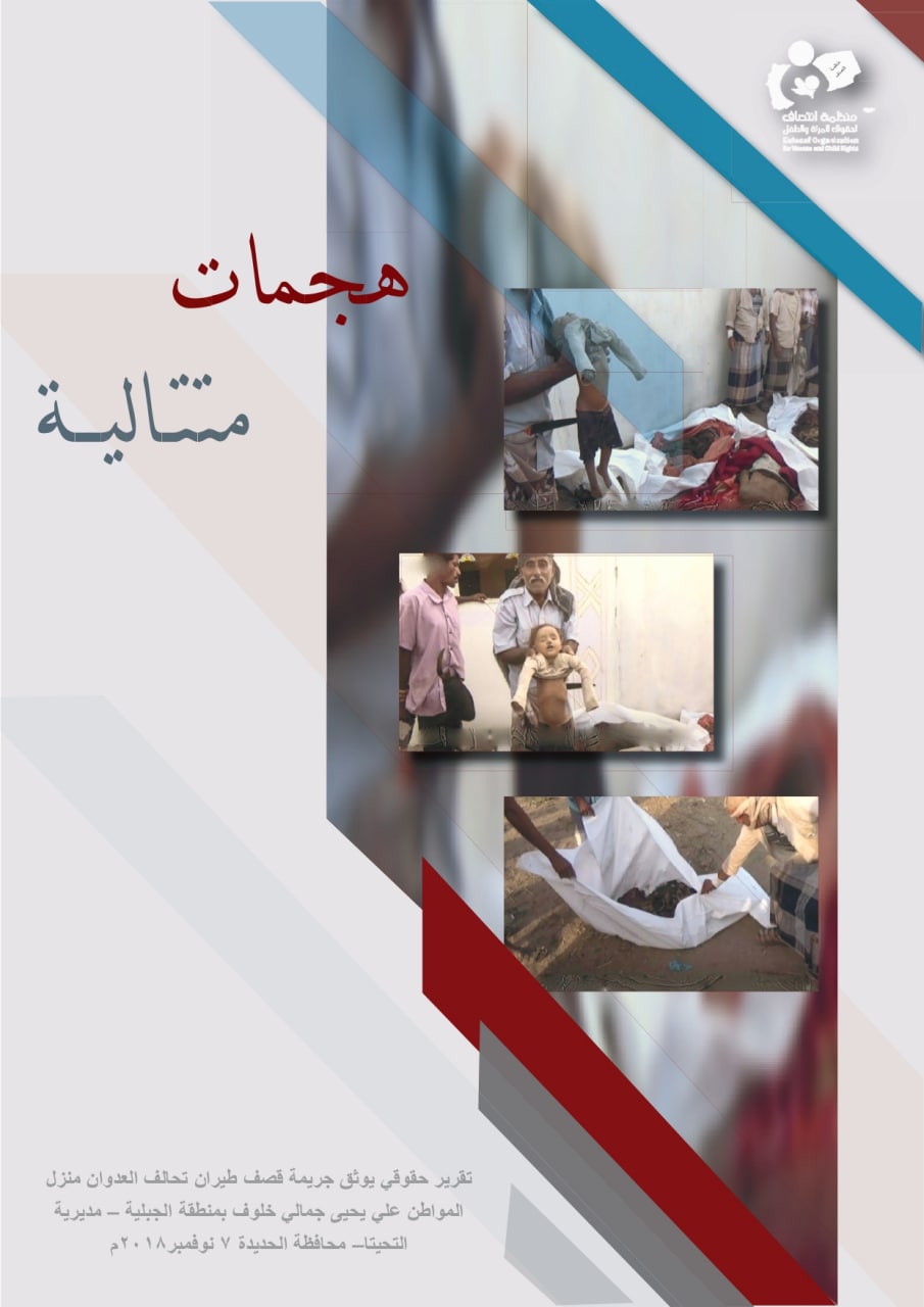 وثقت منظمة انتصاف لحقوق المرأة والطفل تقريراً حقوقياً بعنوان”هجمات متتالية” حيث تناول التقرير الجريمة التي ارتكبها طيران تحالف العدوان بحق منزل المواطن علي يحيي جمالي خلوف بمنطقة الجبلية بمديرية التحيتا التابعة بمحافظة الحديدة والتي را ح ضحيتها مدنيين بينهم نساء و أطفال، وذلك بتاريخ 7 نوفمبر 2018م