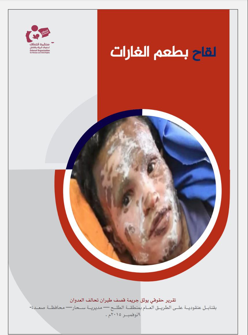 وثقت منظمة انتصاف لحقوق المرأة والطفل تقريراً حقوقياً بعنوان ” لقاح بطعم الغارات “حيث تناول التقرير الجريمة التي ارتكبها طيران تحالف العدوان بقنابل عنقودية على الطريق العام بمنطقة الطلح بمديرية سحار _ محافظة صعدة  والتي را ح ضحيتها مدنيين بينهم نساء و أطفال، وذلك بتاريخ 9 نوفمبر 2015م