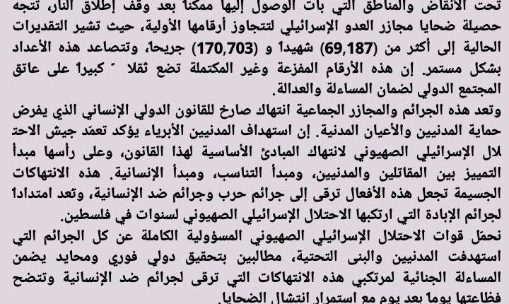 بيان إدانة حول الحصيلة المروعة لضحايا العدوان الإسرائيلي على قطاع غزة وتزايد أعدادهم (69,187) شهيداًو (170,703) جريحا