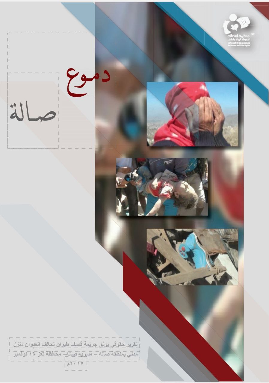 وثقت منظمة انتصاف لحقوق المرأة والطفل تقريراً حقوقياً بعنوان” دموع صالة” حيث تناول التقرير الجريمة التي ارتكبها طيران تحالف العدوان بحق بحق منزل المدني بمنطقة صالة التابعة لمدیریة صالة بمحافظة تعز والتي را ح ضحيتها مدنيين بينهم نساء و أطفال، وذلك بتاريخ 16 نوفمبر 2015م