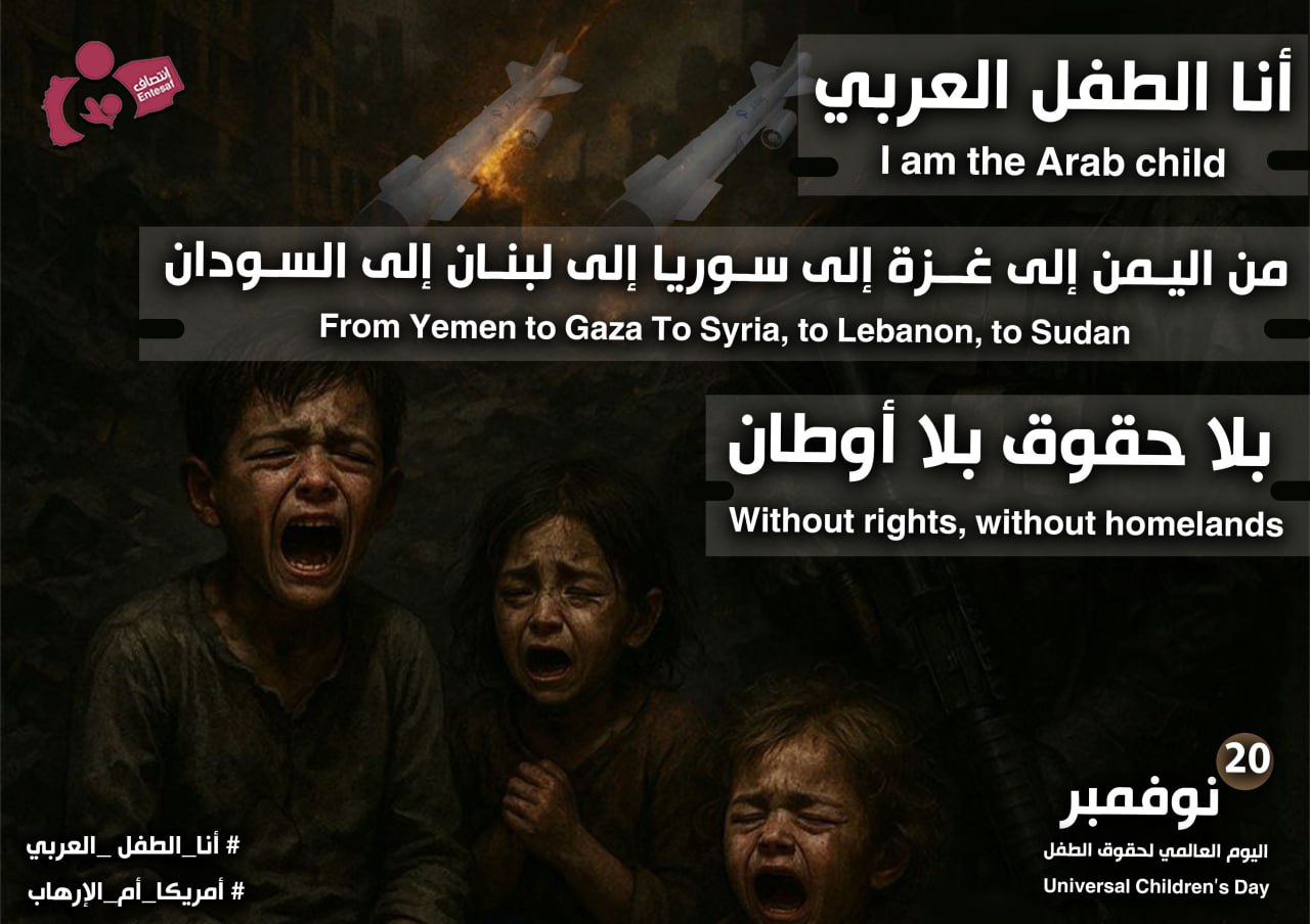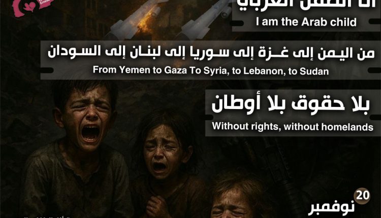 أنا الطفل العربي من اليمن إلى غزة إلى سوريا إلى لبنان إلى السودان بلا حقوق بلا أوطان I am the Arab child, from Yemen to Gaza,to Syria, to Lebanon, to Sudan without rights, without homelands. #20نوفمبر