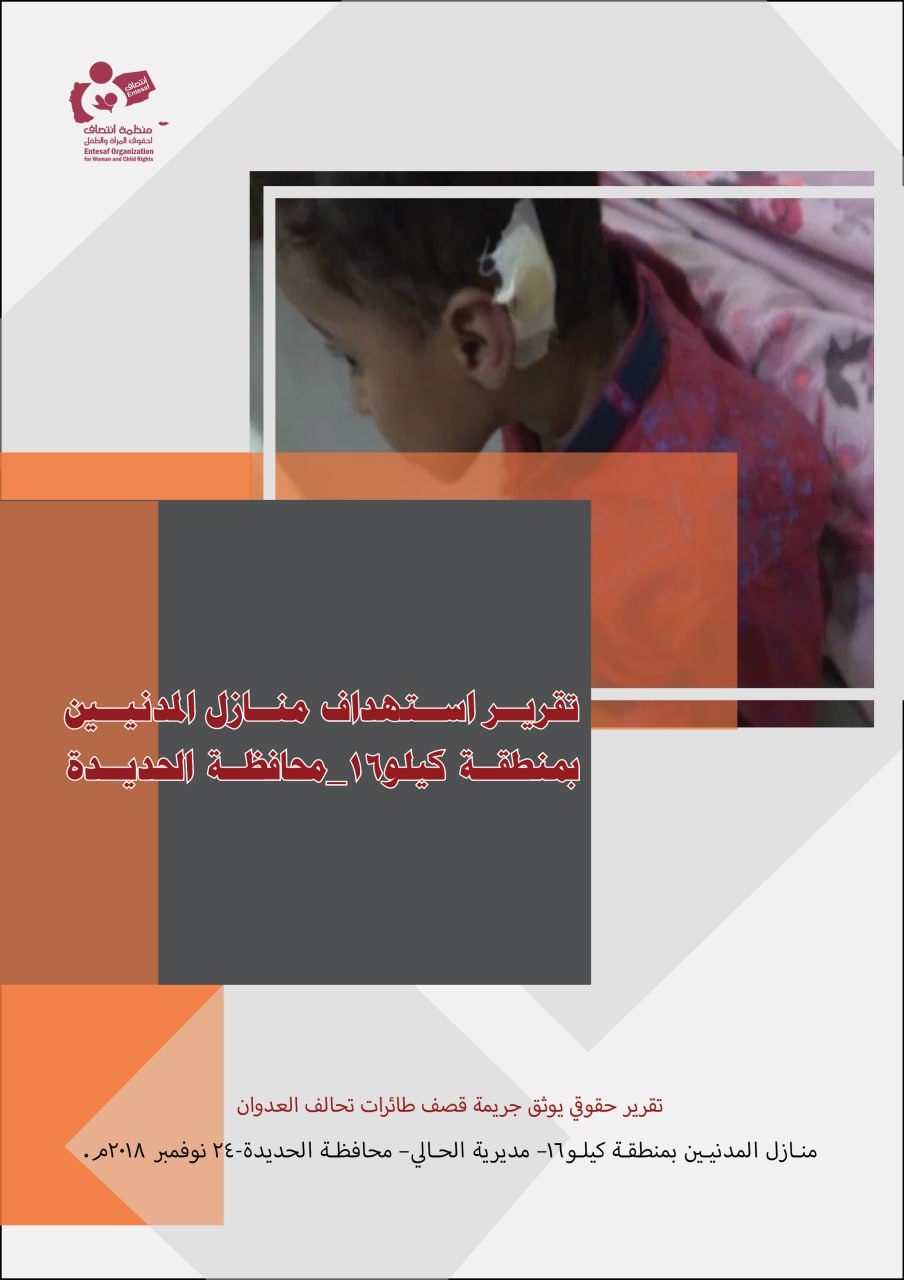 وثقت منظمة انتصاف لحقوق المرأة والطفل تقريراً حقوقياً بعنوان ” تقرير استهداف منازل المدنيين بمنطقة كيلو 16 محافظة الحديدة” حيث تناول التقرير جريمة قصف طيران تحالف العدوان على منازل المدنيين بمنطقة كيلو 16 بمديرية الحالي التابعة لمحافظة الحديدة والتي راح ضحيتها مدنيين بينهم نساء و أطفال، وذلك بتاريخ 24 نوفمبر 2018م