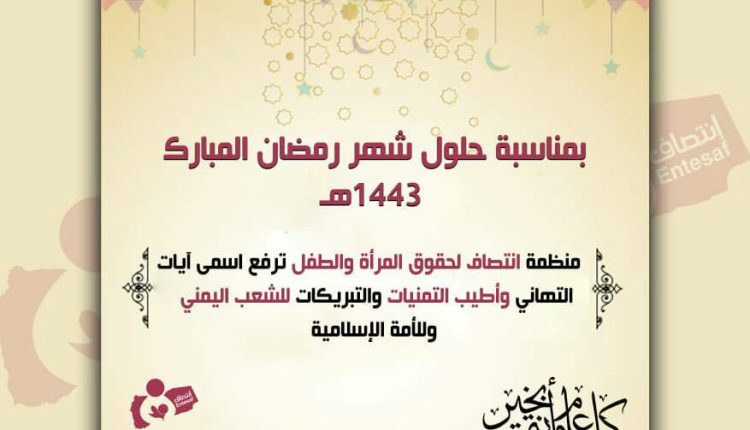 بمناسبة حلول شهر رمضان المبارك 1443ه تهديكم منظمة انتصاف لحقوق المرأة والطفل إسمى آيات التهاني و التبريكات للشعب اليمني و الامة الاسلامية