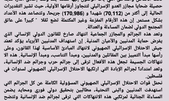 بيان إدانة حول الحصيلة المروعة لضحايا العدوان الإسرائيلي على قطاع غزة وتزايد أعدادهم (70,112) شهيداًو (170,986) جريحا