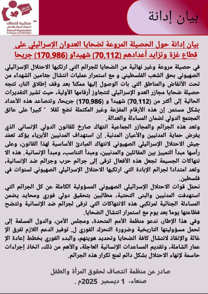 صادر عن منظمة انتصاف لحقوق المرأة والطفل صنعاء
