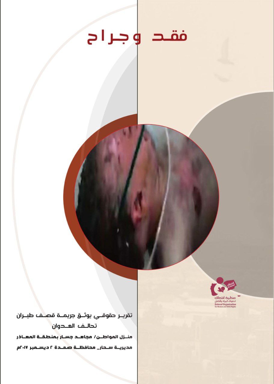 وثقت منظمة انتصاف لحقوق المرأة والطفل تقريراً حقوقياً بعنوان” فقد و جراح” حيث تناول التقرير الجريمة التي ارتكبها طيران تحالف العدوان على منزل المواطن مجاهد جسار بمنطقة المهاذر التابعة لمدیریة سحار بمحافظة صعدة والتي را ح ضحيتها مدنيين بينهم نساء و أطفال، وذلك بتاريخ 2 ديسمبر 2017م