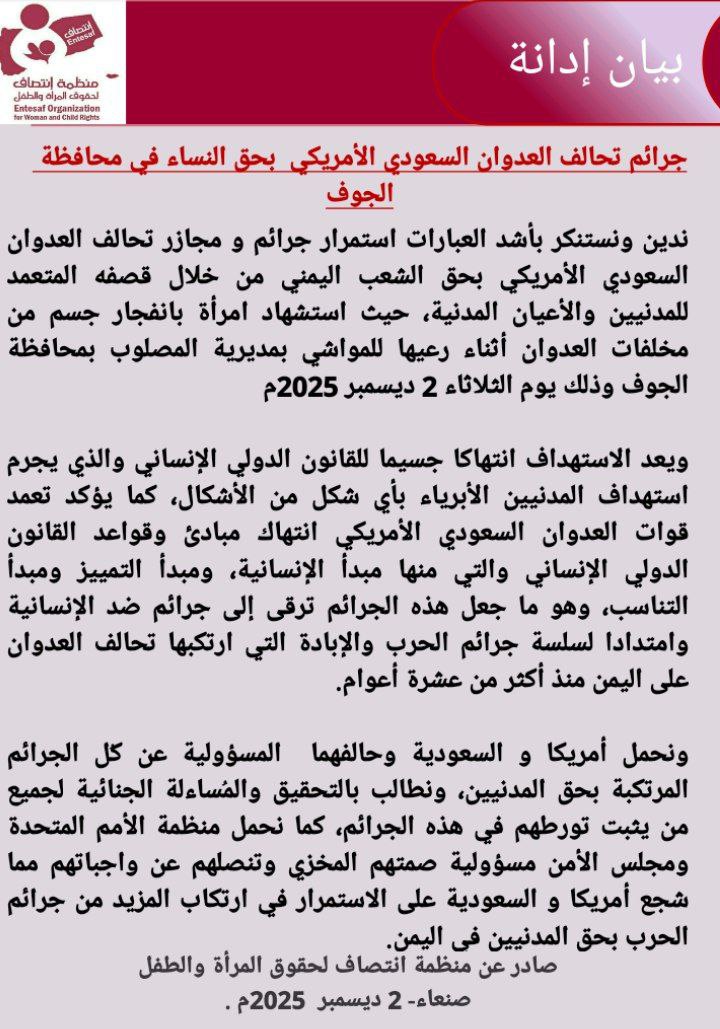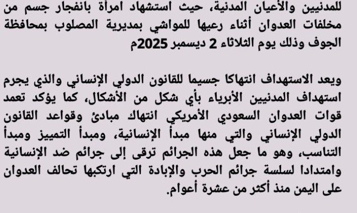 ندين ونستنكر بأشد العبارات استمرار جرائم و مجازر تحالف العدوان السعودي الأمريكي بحق الشعب اليمني من خلال قصفه المتعمد للمدنيين والأعيان المدنية، حيث استشهاد امرأة بانفجار جسم من مخلفات العدوان أثناء رعيها للمواشي بمديرية المصلوب بمحافظة الجوف وذلك يوم الثلاثاء 2 ديسمبر 2025م