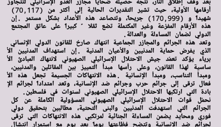 في حصيلة مروعة وغير نهائية من الضحايا للجرائم التي ارتكبها الاحتلال الإسرائيلي الصهيوني بحق الشعب الفلسطيني و مع استمرار عمليات انتشال جثامين الشهداء من تحت الأنقاض والمناطق التي بات الوصول إليها ممكناً بعد وقف إطلاق النار، تتجه حصيلة ضحايا مجازر العدو الإسرائيلي لتتجاوز أرقامها الأولية، حيث تشير التقديرات الحالية إلى أكثر من (70,117) شهيداً و (170,999) جريحاً، وتتصاعد هذه الأعداد بشكل مستمر. إن هذه الأرقام المفزعة وغير المكتملة تضع ثقلاً كبيراً على عاتق المجتمع الدولي لضمان المساءلة والعدالة.