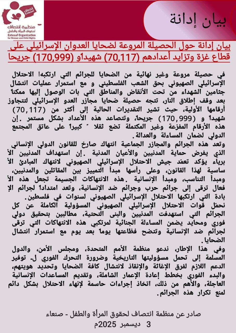 صادر عن منظمة انتصاف لحقوق المرأة والطفل صنعاء