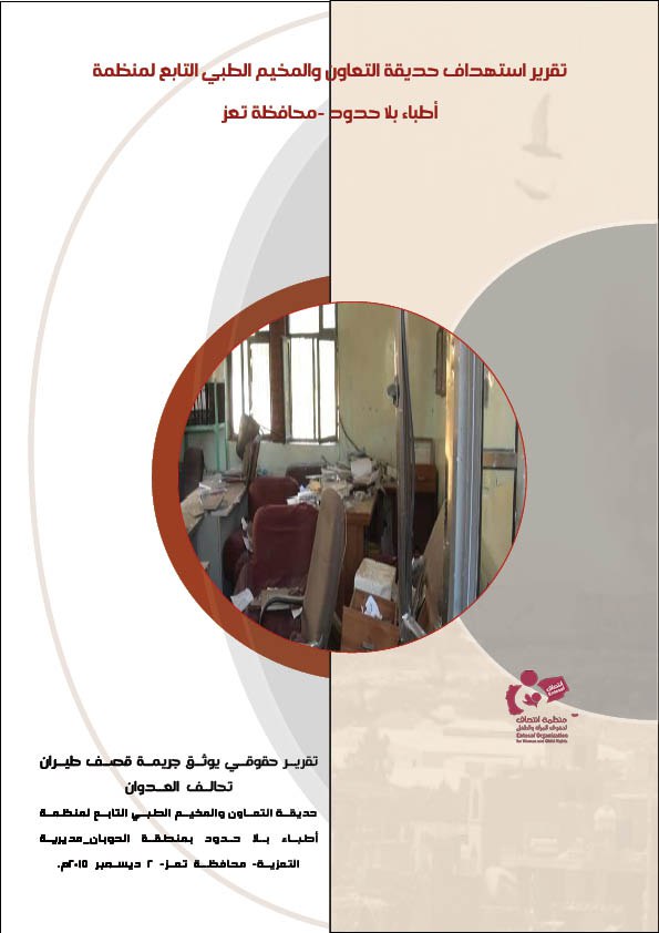 اصدرت منظمة انتصاف لحقوق المرأة والطفل تقريراً حقوقياً يوثق “استهداف حديقة التعاون و المخيم الطبي التابع لمنظمة أطباء بلا حدود بمحافظة تعز”حيث تناول التقرير جريمة قصف طيران تحالف العدوان على حديقة التعاون و المخيم الطبي التابع لمنظمة أطباء بلا حدود بمنطقة الحوبان بمديرية التعزية بمحافظة تعز على والتي راح ضحيتها مدنيين بينهم نساء و أطفال، وذلك بتاريخ 2 ديسمبر 2015م