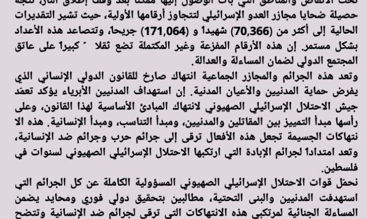 بيان إدانة حول الحصيلة المروعة لضحايا العدوان الإسرائيلي على قطاع غزة وتزايد أعدادهم (70,366) شهيداًو (171,064) جريحا