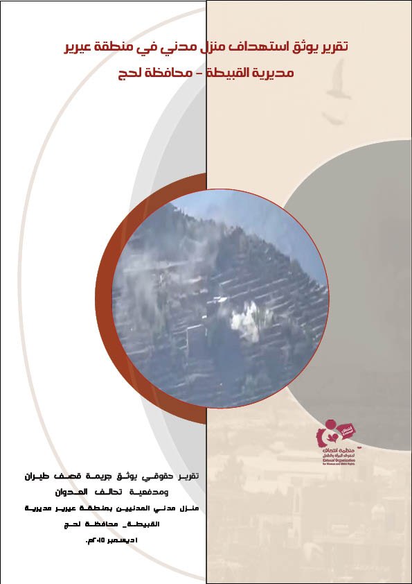 اصدرت منظمة انتصاف لحقوق المرأة والطفل تقريراً حقوقياً يوثق “استهداف منزل مدني بمنطقة عيرير بمديرية القبيطة بمحافظة لحج “حيث تناول التقرير جريمة قصف طيران و مدفعية تحالف العدوان على منزل مدني بمنطقة عيرير بمديرية القبيطة بمحافظة لحج على والتي راح ضحيتها مدنيين بينهم نساء و أطفال، وذلك بتاريخ 1 ديسمبر 2015م