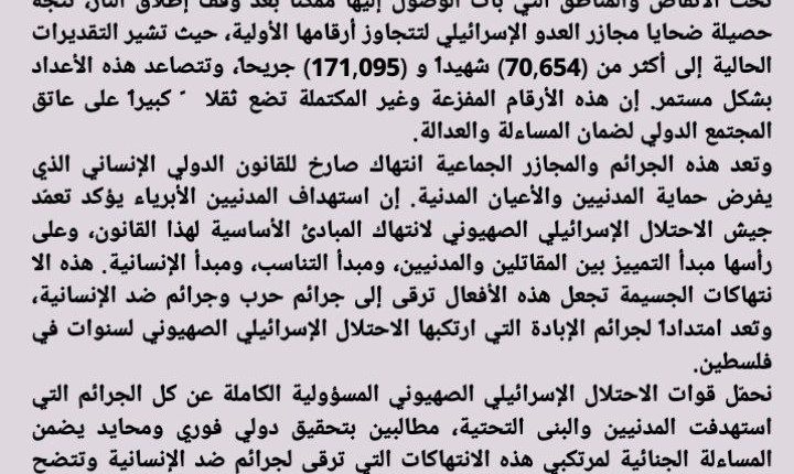 بيان إدانة حول الحصيلة المروعة لضحايا العدوان الإسرائيلي على قطاع غزة وتزايد أعدادهم (70,654) شهيداًو (171,095) جريحا