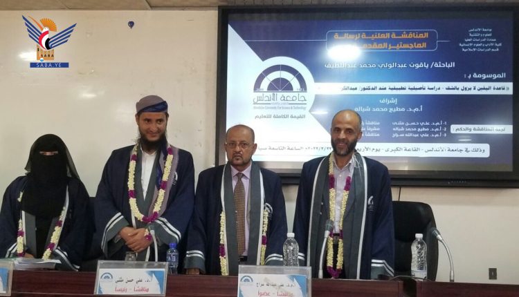 نالت الباحثة ياقوت عبدالولي محمد عبداللطيف، درجة الماجستير بامتياز في الدراسات الإسلامية تخصص فقه مقارن من كلية الآداب والعلوم الإنسانية، بجامعة الأندلس للعلوم والتقنية، عن رسالتها الموسومة بـ “قاعدة اليقين لا يزول بالشك – دراسة تأصيلية تطبيقية عند الدكتور عبدالكريم زيدان”.