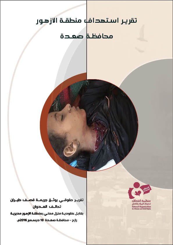اصدرت منظمة انتصاف لحقوق المرأة والطفل تقريراً حقوقياً يوثق “استهداف منطقة الازهور بمحافظة صعدة “حيث تناول التقرير جريمة قصف طيران تحالف العدوان على منزل مدني بمنطقة الازهور بمديرية رازح بمحافظة صعدة على والتي راح ضحيتها مدنيين بينهم نساء و أطفال، وذلك بتاريخ 18 ديسمبر 2016م
