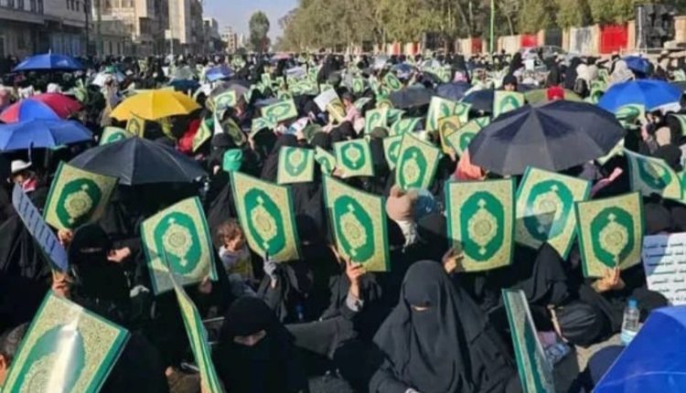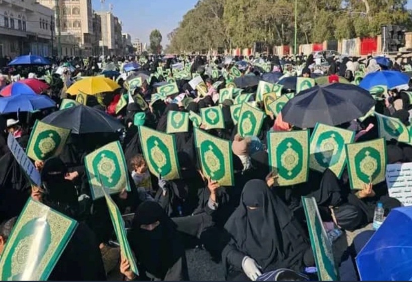 ورددّت المشاركات هتافاتٍ إيمانية مدوّية، أكدن فيها أن القرآن الكريم محفوظٌ بعهد الله، وأن كل محاولات التدنيس لن تزيد الأمة إلا تمسكًا بكتاب ربها، ورفضًا للطغيان والاستكبار العالمي.