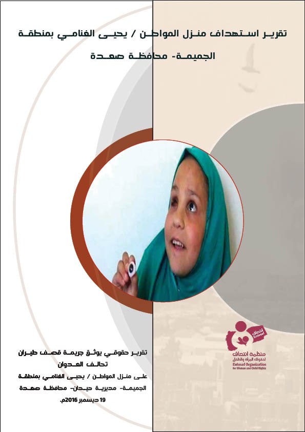 اصدرت منظمة انتصاف لحقوق المرأة والطفل تقريراً حقوقياً يوثق “استهداف منزل المواطن يحيى الغنامي بمنطقة الجميمة بمحافظة صعدة “حيث تناول التقرير جريمة قصف طيران تحالف العدوان على منزل المواطن يحيى الغنامي بمنطقة الجميمة بمديرية حيدان بمحافظة صعدة على والتي راح ضحيتها مدنيين بينهم نساء و أطفال، وذلك بتاريخ 19 ديسمبر 2016م