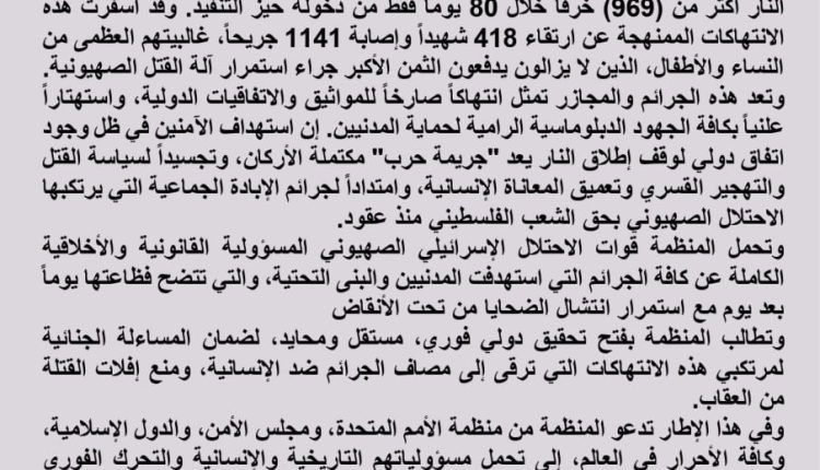وتحمل المنظمة قوات الاحتلال الإسرائيلي الصهيوني المسؤولية القانونية والأخلاقية الكاملة عن كافة الجرائم التي استهدفت المدنيين والبنى التحتية، والتي تتضح فظاعتها يوماً بعد يوم مع استمرار انتشال الضحايا من تحت الأنقاض