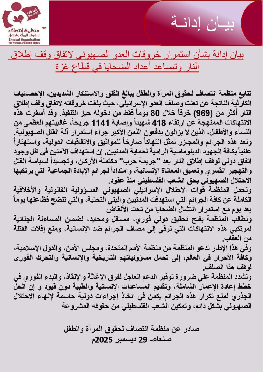 تتابع منظمة انتصاف لحقوق المرأة والطفل ببالغ القلق والاستنكار الشديدين، الإحصائيات الكارثية الناتجة عن تعنت وصلف العدو الإسرائيلي، حيث بلغت خروقاته لاتفاق وقف إطلاق النار أكثر من (969) خرقاً خلال 80 يوماً فقط من دخوله حيز التنفيذ. وقد أسفرت هذه الانتهاكات الممنهجة عن ارتقاء 418 شهيداً وإصابة 1141 جريحاً، غالبيتهم العظمى من النساء والأطفال، الذين لا يزالون يدفعون الثمن الأكبر جراء استمرار آلة القتل الصهيونية.