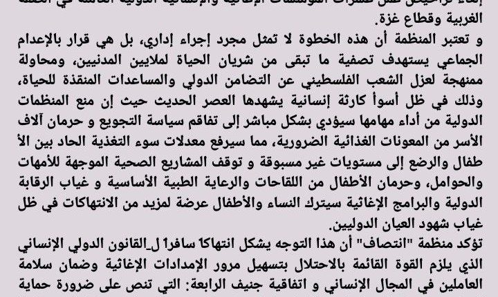 و تعتبر المنظمة أن هذه الخطوة لا تُمثل مجرد إجراء إداري، بل هي قرار بالإعدام الجماعي يستهدف تصفية ما تبقى من شريان الحياة لملايين المدنيين، ومحاولة ممنهجة لعزل الشعب الفلسطيني عن التضامن الدولي والمساعدات المنقذة للحياة، وذلك في ظل أسوأ كارثة إنسانية يشهدها العصر الحديث حيث إن منع المنظمات الدولية من أداء مهامها سيؤدي بشكل مباشر إلى