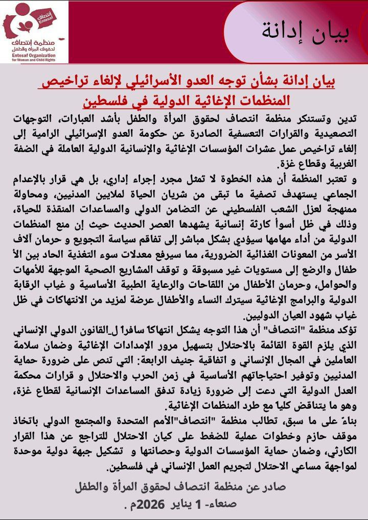 تُدين وتستنكر منظمة انتصاف لحقوق المرأة والطفل بأشد العبارات، التوجهات التصعيدية والقرارات التعسفية الصادرة عن حكومة العدو الإسرائيلي الرامية إلى إلغاء تراخيص عمل عشرات المؤسسات الإغاثية والإنسانية الدولية العاملة في الضفة الغربية وقطاع غزة.
