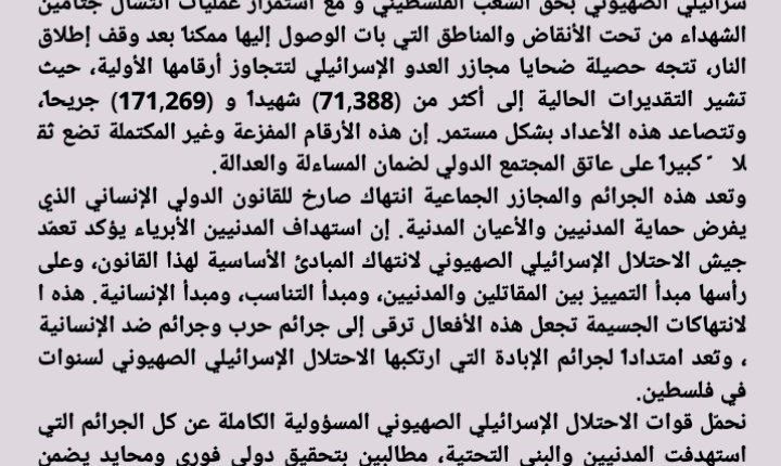 بيان إدانة حول الحصيلة المروعة لضحايا العدوان الإسرائيلي على قطاع غزة وتزايد أعدادهم (71,388) شهيداًو (171,269) جريحا