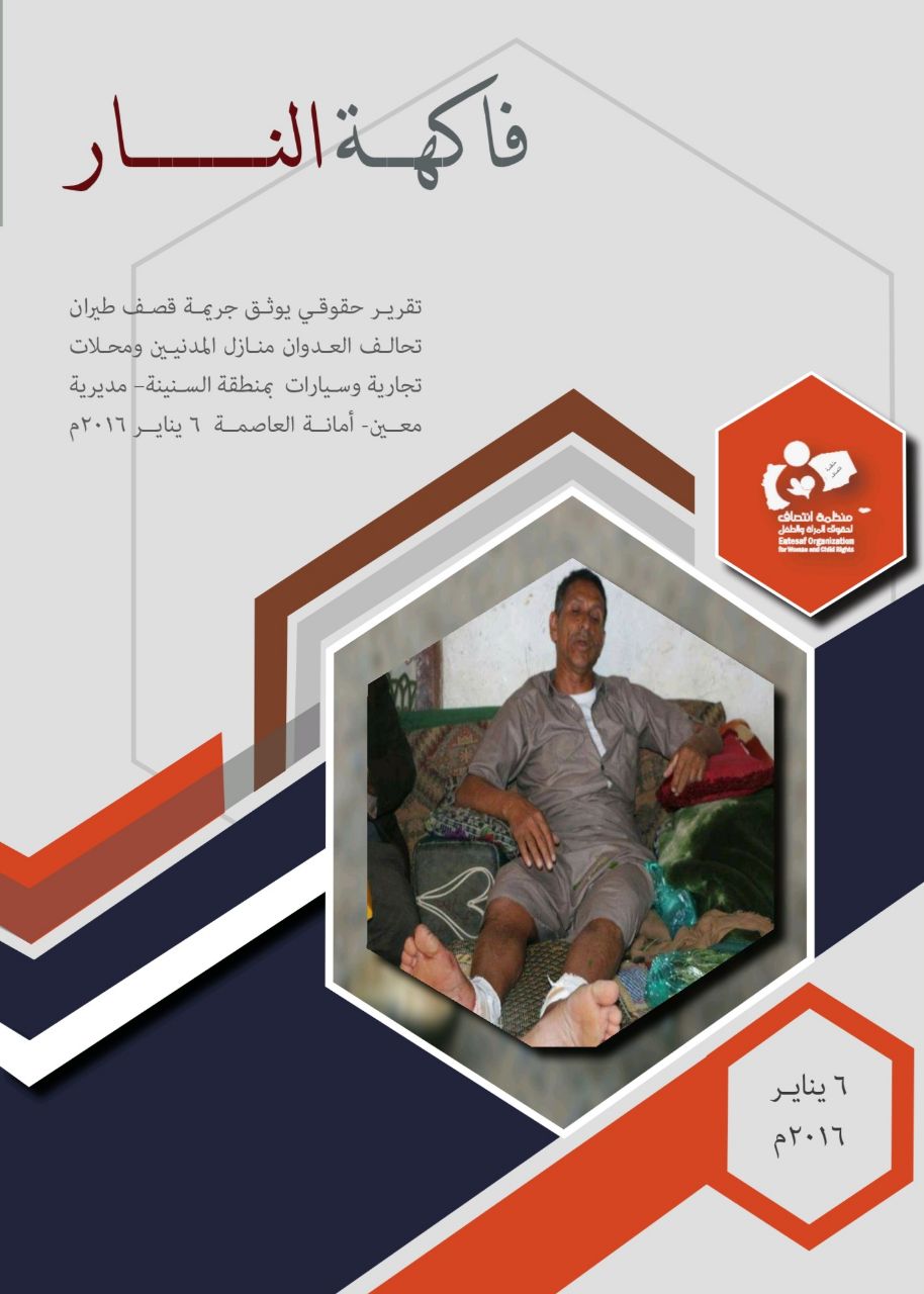 وثقت منظمة انتصاف لحقوق المرأة والطفل تقريراً حقوقياً بعنوان”فاكهة النار” حيث تناول التقرير الجريمة التي ارتكبها طيران تحالف العدوان على منازل المدنيين و محلات تجارية و سيارات بمنطقة السنينة التابعة لمدیریة معين بمحافظة امانه العاصمة والتي را ح ضحيتها مدنيين بينهم نساء و أطفال، وذلك بتاريخ 6 يناير 2016م