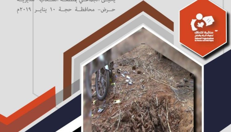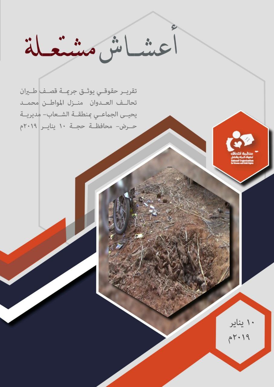 وثقت منظمة انتصاف لحقوق المرأة والطفل تقريراً حقوقياً بعنوان”أعشاش مشتعلة” حيث تناول التقرير الجريمة التي ارتكبها طيران تحالف العدوان على منزل المواطن محمد يحيي الجماعي بمنطقة الشعاب التابعة لمدیریة حرض بمحافظة حجة والتي را ح ضحيتها مدنيين بينهم نساء و أطفال، وذلك بتاريخ 10 يناير 2019م