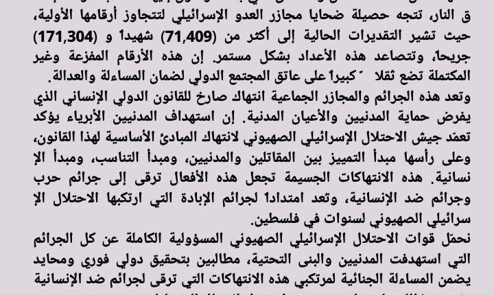 بيان إدانة حول الحصيلة المروعة لضحايا العدوان الإسرائيلي على قطاع غزة وتزايد أعدادهم (71,409) شهيداًو (171,304) جريحا