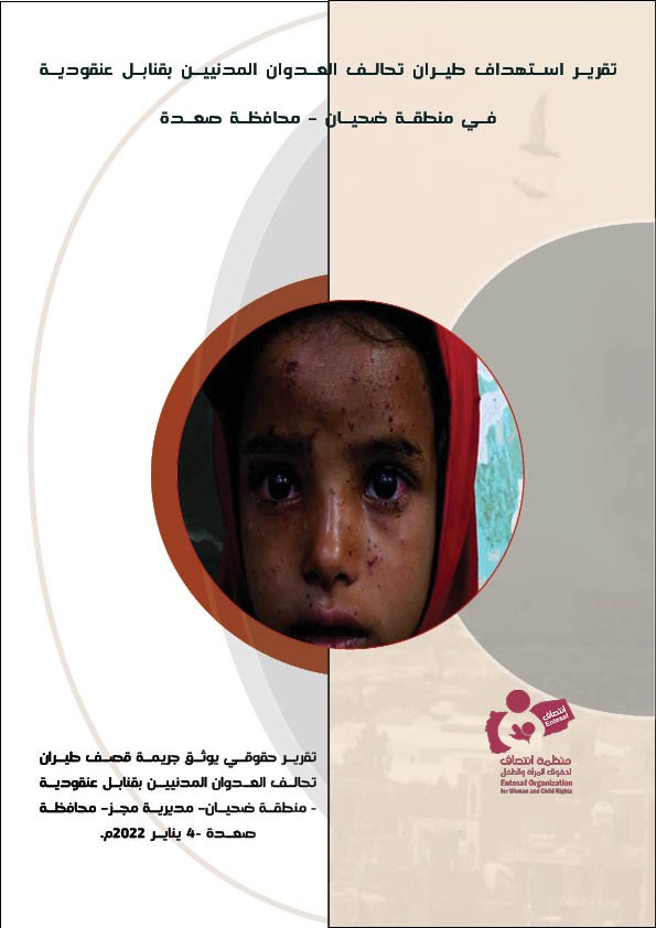 اصدرت منظمة انتصاف لحقوق المرأة والطفل تقريراً حقوقياً يوثق “استهداف المدنيين بقنابل عنقودية بمنطقة ضحيان بمحافظة صعدة”حيث تناول التقرير جريمة قصف مدفعية تحالف العدوان على المدنيين بقنابل عنقودية بمنطقة ضحيان بمديرية مجز بمحافظة صعدة على والتي راح ضحيتها مدنيين بينهم نساء و أطفال، وذلك بتاريخ 4 يناير 2022م