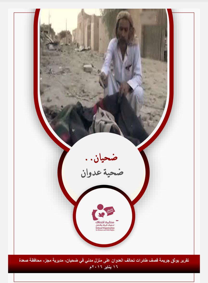 وثقت منظمة انتصاف لحقوق المرأة والطفل تقريراً حقوقياً بعنوان”ضحيان ضحية عدوان” حيث تناول التقرير الجريمة التي ارتكبها طيران تحالف العدوان على منزل مدني بمنطقة ضحيان التابعة لمديرية مجز بمحافظة صعدة والتي را ح ضحيتها مدنيين بينهم نساء و أطفال، وذلك بتاريخ 16 يناير 2016م