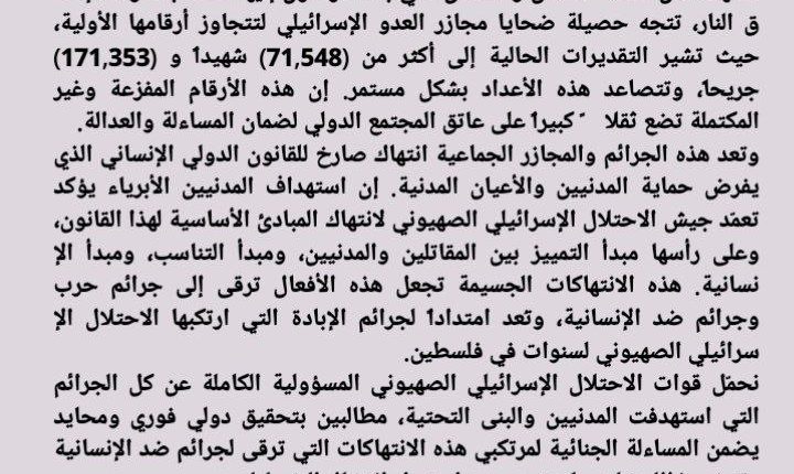بيان إدانة حول الحصيلة المروعة لضحايا العدوان الإسرائيلي على قطاع غزة وتزايد أعدادهم (71,548) شهيداًو (171,353) جريحا