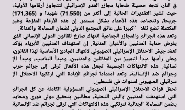 بيان إدانة حول الحصيلة المروعة لضحايا العدوان الإسرائيلي على قطاع غزة وتزايد أعدادهم (71,550) شهيداًو (171,365) جريحا