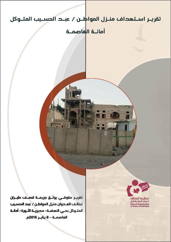 اصدرت منظمة انتصاف لحقوق المرأة والطفل تقريراً حقوقياً يوثق “استهداف منزل المواطن عبد الحسيب المتوكل بأمانة العاصمة”حيث تناول التقرير جريمة قصف طيران تحالف العدوان على منزل المواطن عبد الحسيب المتوكل بحي النهضة بمديرية الثورة بأمانة العاصمة والتي راح ضحيتها مدنيين بينهم نساء و أطفال، وذلك بتاريخ 8 يناير 2016م