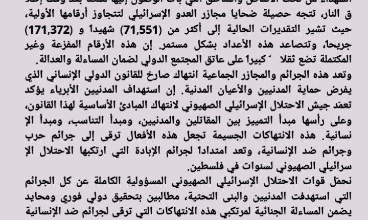 بيان إدانة حول الحصيلة المروعة لضحايا العدوان الإسرائيلي على قطاع غزة وتزايد أعدادهم (71,551) شهيداًو (171,372) جريحا