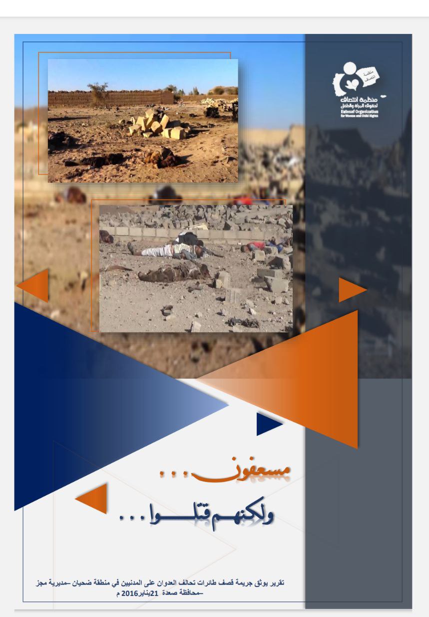 وثقت منظمة انتصاف لحقوق المرأة والطفل تقريراً حقوقياً بعنوان”مسعفون ولكنهم قتلوا” حيث تناول التقرير الجريمة التي ارتكبها طيران تحالف العدوان على المدنيين بمنطقة ضحيان التابعة لمدیریة مجز بمحافظة صعدة والتي را ح ضحيتها مدنيين بينهم نساء و أطفال، وذلك بتاريخ 21 يناير 2016م