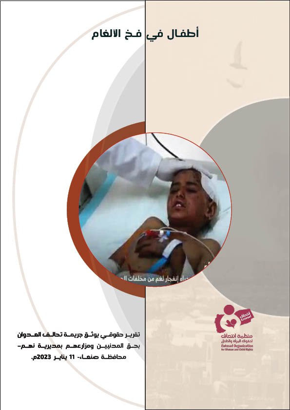 اصدرت منظمة انتصاف لحقوق المرأة والطفل تقريراً حقوقياً بعنوان “أطفال في فخ الالغام”حيث تناول التقرير جريمة قصف طيران تحالف العدوان على المدنيين و مزارعهم بمديرية نهم بمحافظة صنعاء والتي راح ضحيتها مدنيين بينهم نساء و أطفال، وذلك بتاريخ 11 يناير 2023م