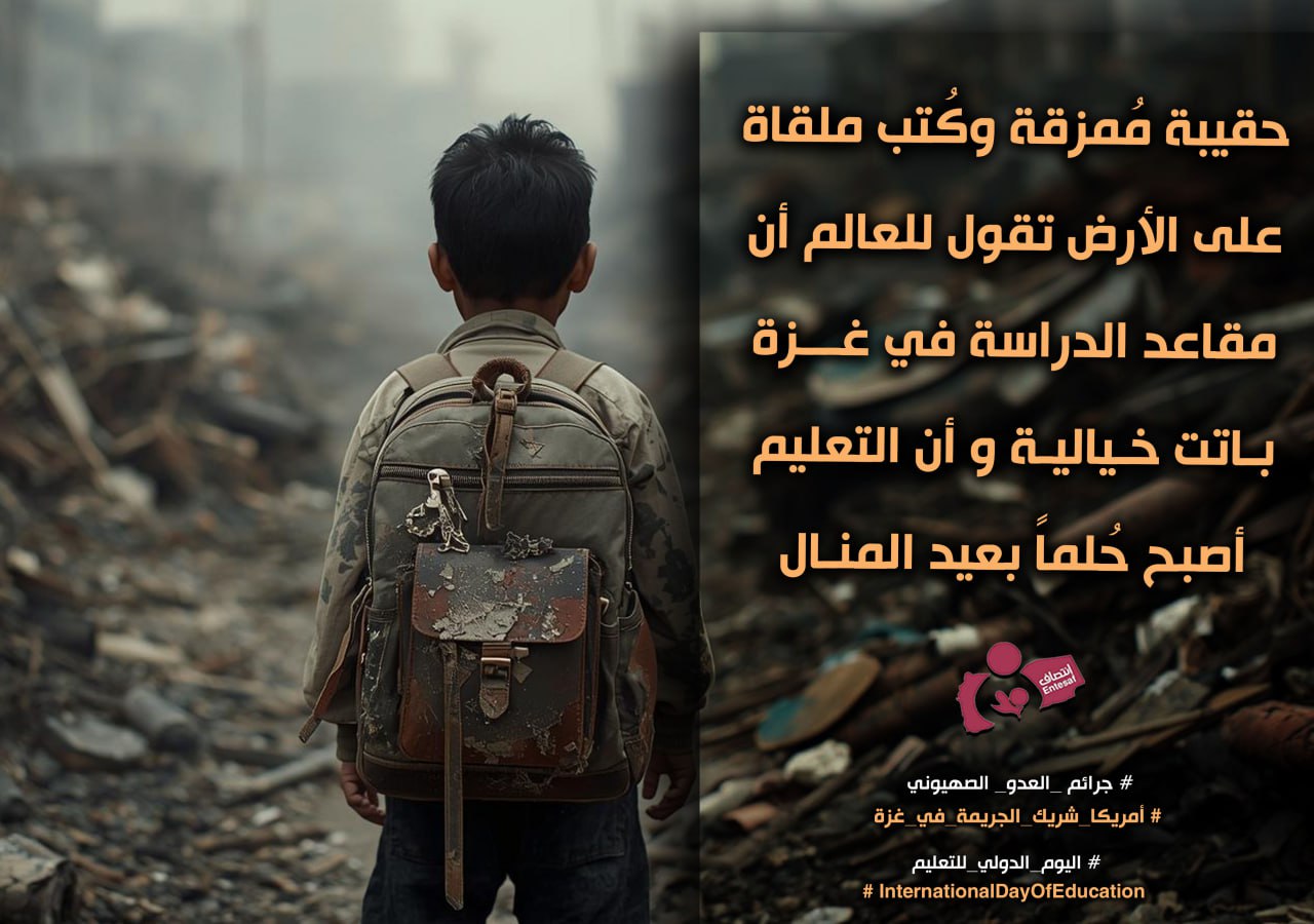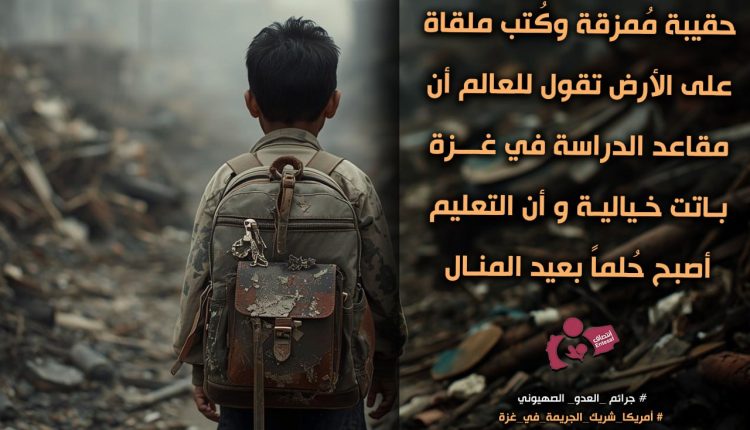 حقيبة ممزقة و كتب ملقاة على الأرض تقول للعالم أن مقاعد الدراسة في غزة باتت خيالية و أن التعليم أصبح حلماً بعيد المنال