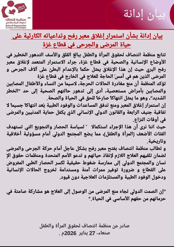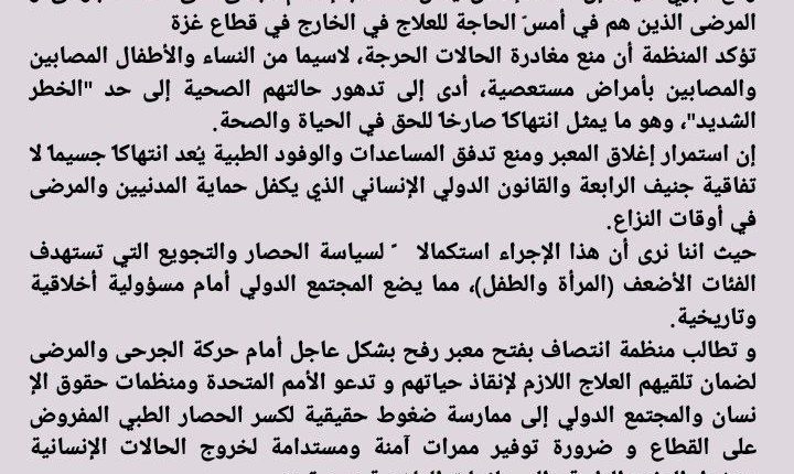 و تطالب منظمة انتصاف بفتح معبر رفح بشكل عاجل أمام حركة الجرحى والمرضى لضمان تلقيهم العلاج اللازم لإنقاذ حياتهم و تدعو الأمم المتحدة ومنظمات حقوق الإنسان والمجتمع الدولي إلى ممارسة ضغوط حقيقية لكسر الحصار الطبي المفروض على القطاع و ضرورة توفير ممرات آمنة ومستدامة لخروج الحالات الإنسانية ودخول الوفود الطبية والمستلزمات العلاجية دون قيود.