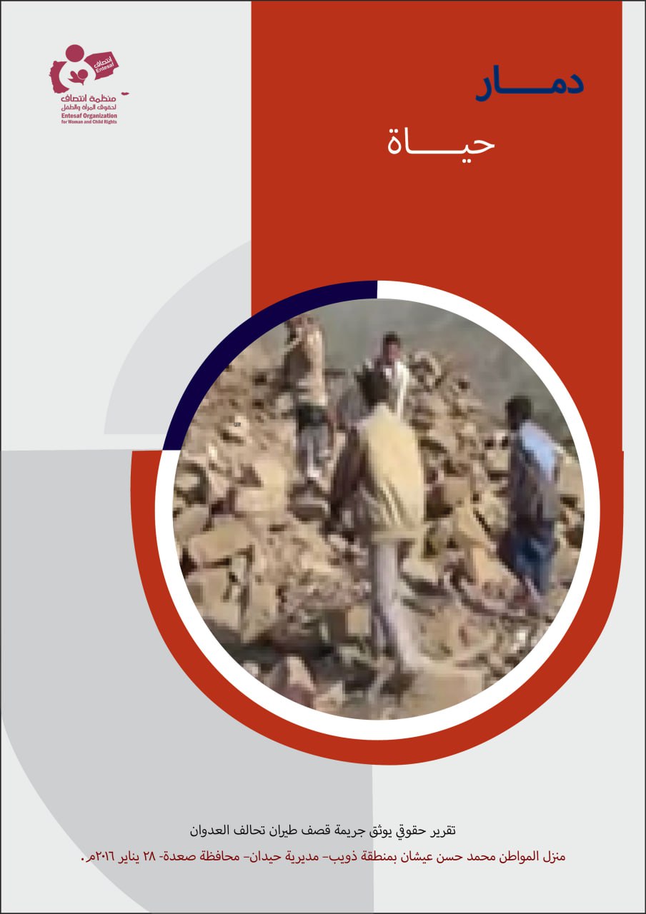 وثقت منظمة انتصاف لحقوق المرأة والطفل تقريراً حقوقياً بعنوان “دمار حياة ” حيث تناول التقرير الجريمة التي ارتكبها طيران تحالف العدوان على منزل المواطن محمد حسن عيشان بمنطقة ذويب التابعة لمديرية حيدان بمحافظة صعدة والتي را ح ضحيتها مدنيين بينهم نساء و أطفال، وذلك بتاريخ 28 يناير 2016م