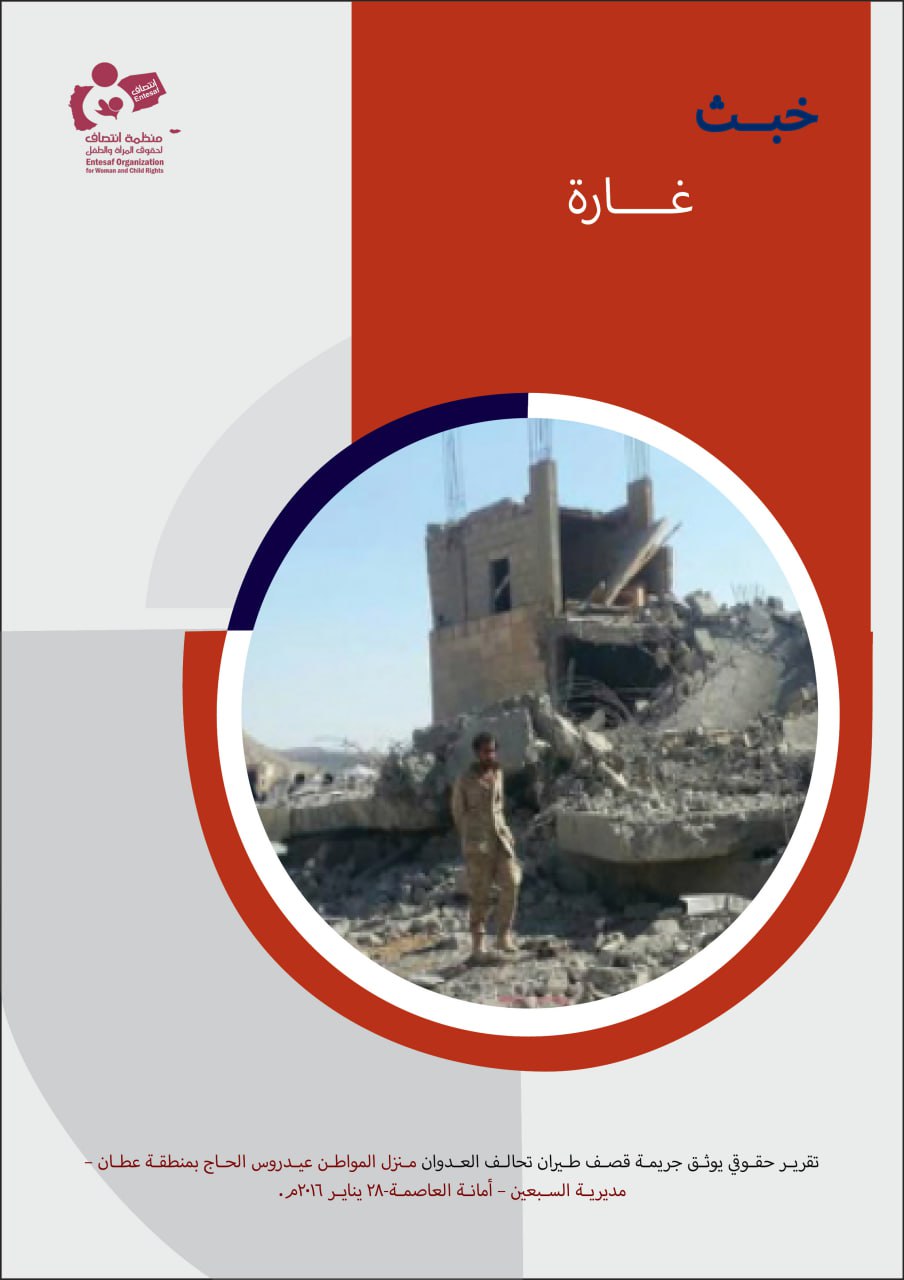 وثقت منظمة انتصاف لحقوق المرأة والطفل تقريراً حقوقياً بعنوان ” خبث غارة” حيث تناول التقرير الجريمة التي ارتكبها طيران تحالف العدوان على منزل المواطن عيدروس الحاج بمنطقة عطان التابعة لمديرية السبعين بأمانة العاصمة والتي را ح ضحيتها مدنيين بينهم نساء و أطفال، وذلك بتاريخ 28 يناير 2016م