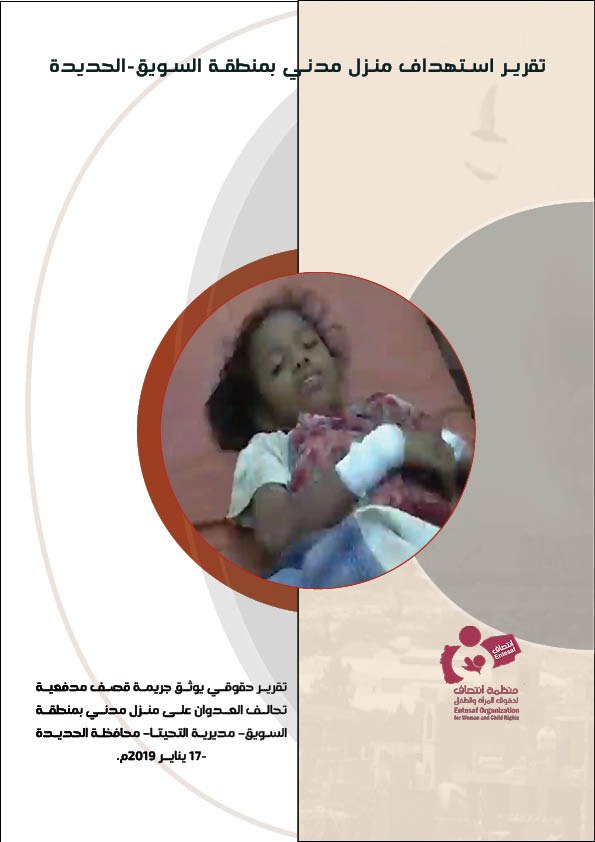 اصدرت منظمة انتصاف لحقوق المرأة والطفل تقريراً حقوقياً يوثق ” استهداف منزل مدني بمنطقة السويق بمحافظة الحديدة”حيث تناول التقرير جريمة قصف طيران تحالف العدوان على منزل مدني بمنطقة السويق بمديرية التحيتا بمحافظة الحديدة والتي راح ضحيتها مدنيين بينهم نساء و أطفال، وذلك بتاريخ 17 يناير 2019م