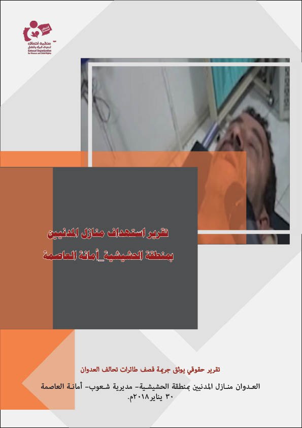 وثقت منظمة انتصاف لحقوق المرأة والطفل تقريراً حقوقياً بعنوان ” تقرير استهداف منازل المدنيين بمنطقة الحشيشية – أمانة العاصمة” حيث تناول التقرير الجريمة التي ارتكبها طيران تحالف العدوان على منازل المدنيين بمنطقة الحشيشية التابعة لمديرية شعوب بأمانة العاصمة والتي را ح ضحيتها مدنيين بينهم نساء و أطفال، وذلك بتاريخ 30 يناير 2018م