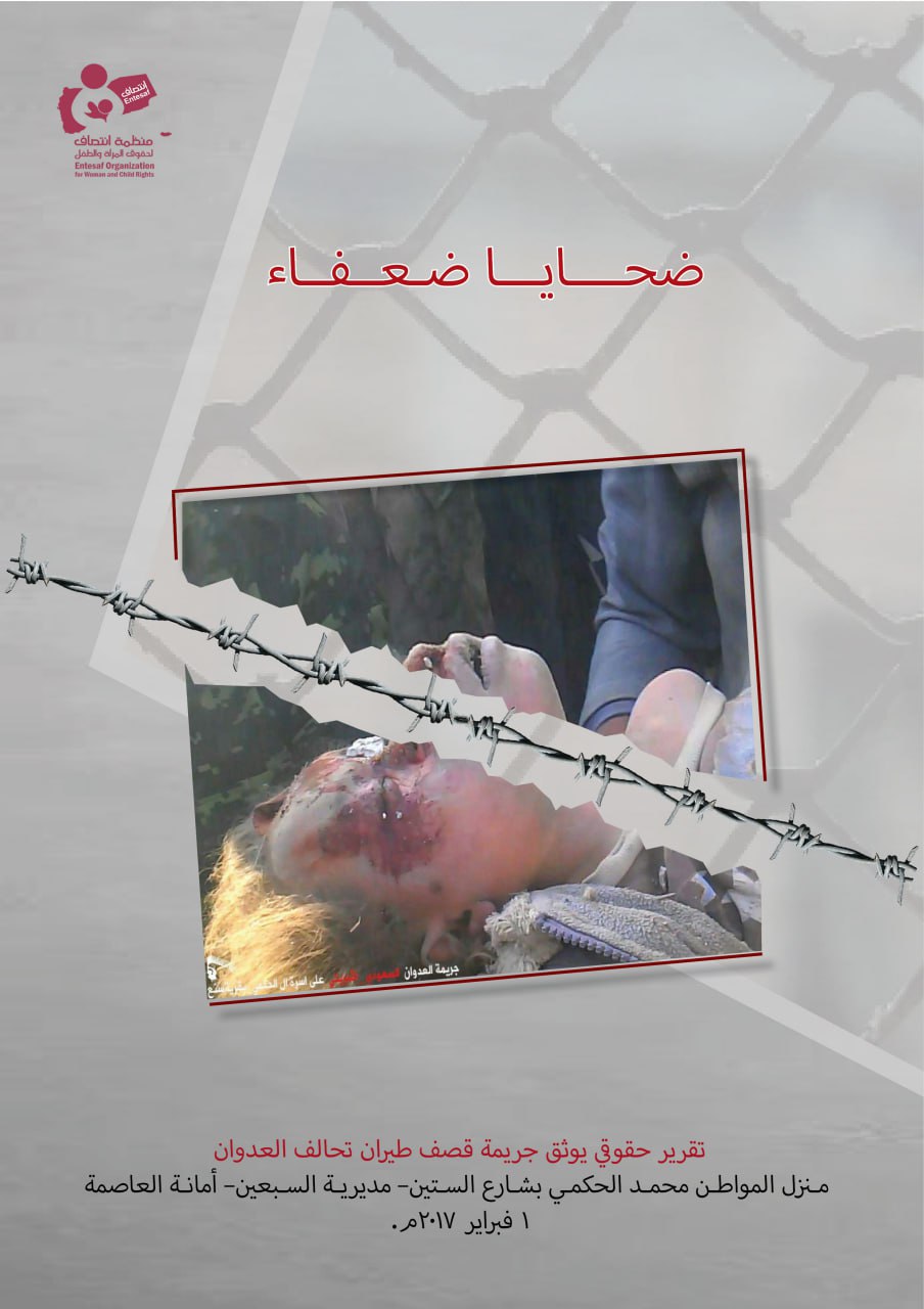 وثقت منظمة انتصاف لحقوق المرأة والطفل تقريراً حقوقياً بعنوان “ضحايا ضعفاء ” حيث تناول التقرير الجريمة التي ارتكبها طيران تحالف العدوان على منزل المواطن محمد الحكمي بمنطقة الستين التابعة لمديرية السبعين بأمانة العاصمة والتي را ح ضحيتها مدنيين بينهم نساء و أطفال، وذلك بتاريخ 1 فبراير 2017م
