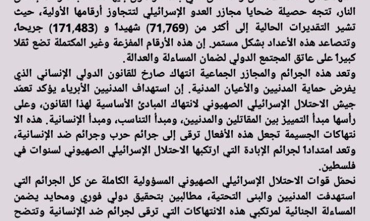 بيان إدانة حول الحصيلة المروعة لضحايا العدوان الإسرائيلي على قطاع غزة وتزايد أعدادهم (71,769) شهيداًو (171,483) جريحا