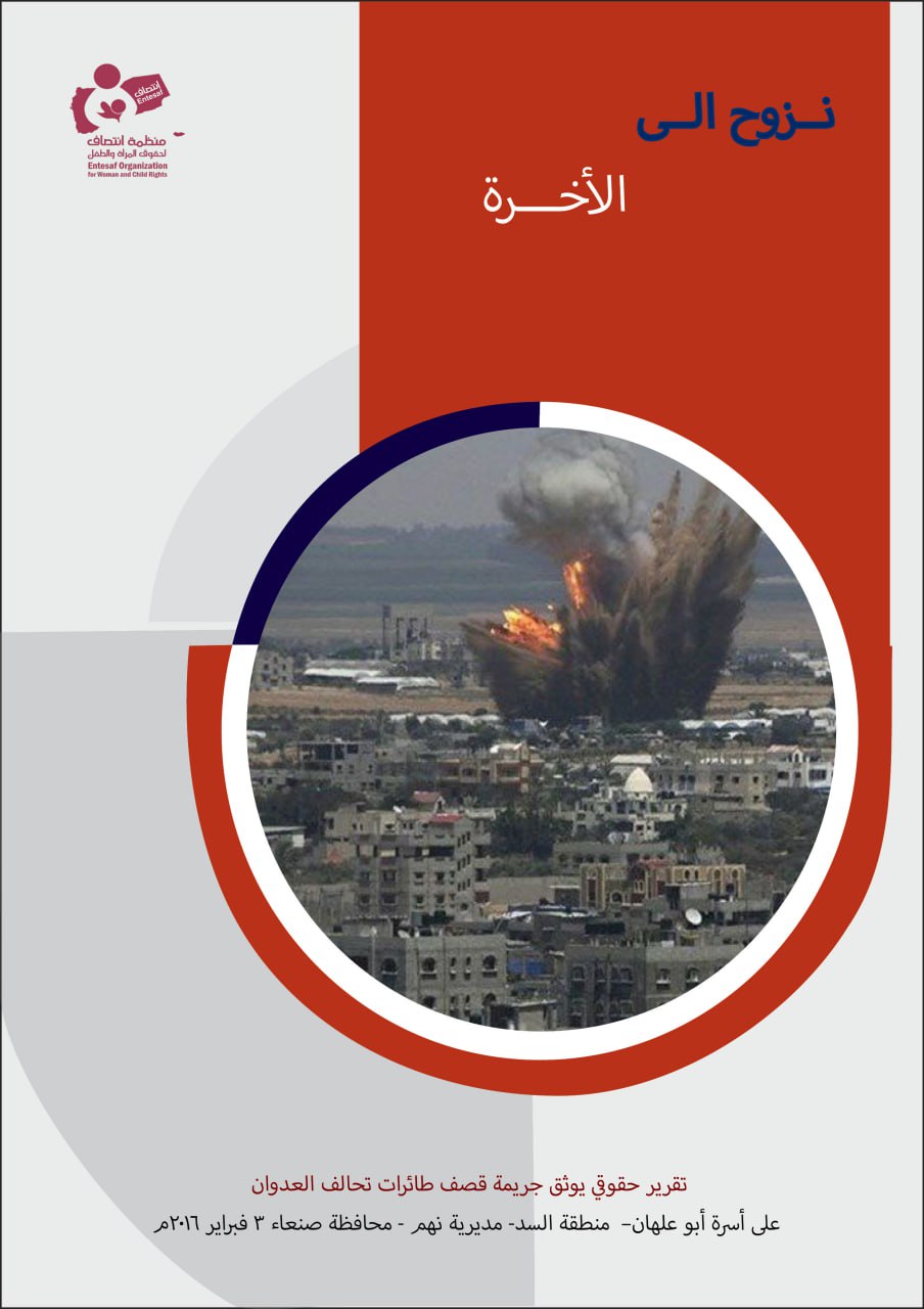 وثقت منظمة انتصاف لحقوق المرأة والطفل تقريراً حقوقياً بعنوان ” نزوح الى الأخرة” حيث تناول التقرير الجريمة التي ارتكبها طيران تحالف العدوان على أسرة أبو علهان بمنطقة السد بمديرية نهم بمحافظة صنعاء والتي را ح ضحيتها مدنيين بينهم نساء و أطفال، وذلك بتاريخ 3 فبراير 2016م