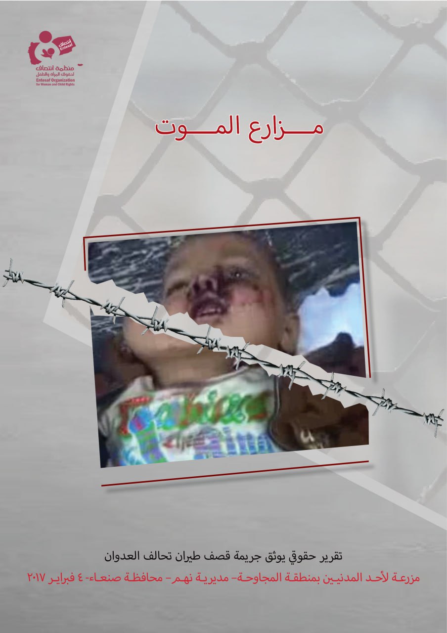 أصدرت منظمة انتصاف لحقوق المرأة والطفل تقريراً حقوقياً بعنوان ” مزارع الموت” حيث تناول التقرير الجريمة التي ارتكبها طيران تحالف العدوان على مزرعة لاحد المدنيين بمنطقة المجاوحة بمديرية نهم بمحافظة صنعاء والتي را ح ضحيتها مدنيين بينهم نساء و أطفال، وذلك بتاريخ 4 فبراير 2017م