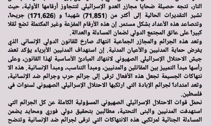 بيان إدانة حول الحصيلة المروعة لضحايا العدوان الإسرائيلي على قطاع غزة وتزايد أعدادهم (71,851) شهيداًو (171,626) جريحا