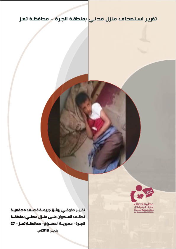اصدرت منظمة انتصاف لحقوق المرأة والطفل تقريراً حقوقياً يوثق ” استهداف منزل مدني بمنطقة الجرة بمحافظة تعز”حيث تناول التقرير جريمة قصف طيران تحالف العدوان على منزل مدني بمنطقة الجرة بمديرية المسراخ بمحافظة تعز والتي راح ضحيتها مدنيين بينهم نساء و أطفال، وذلك بتاريخ 27 يناير 2018م
